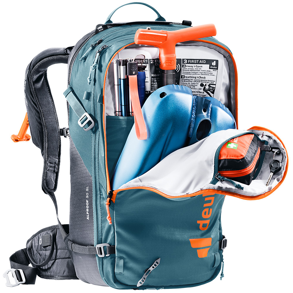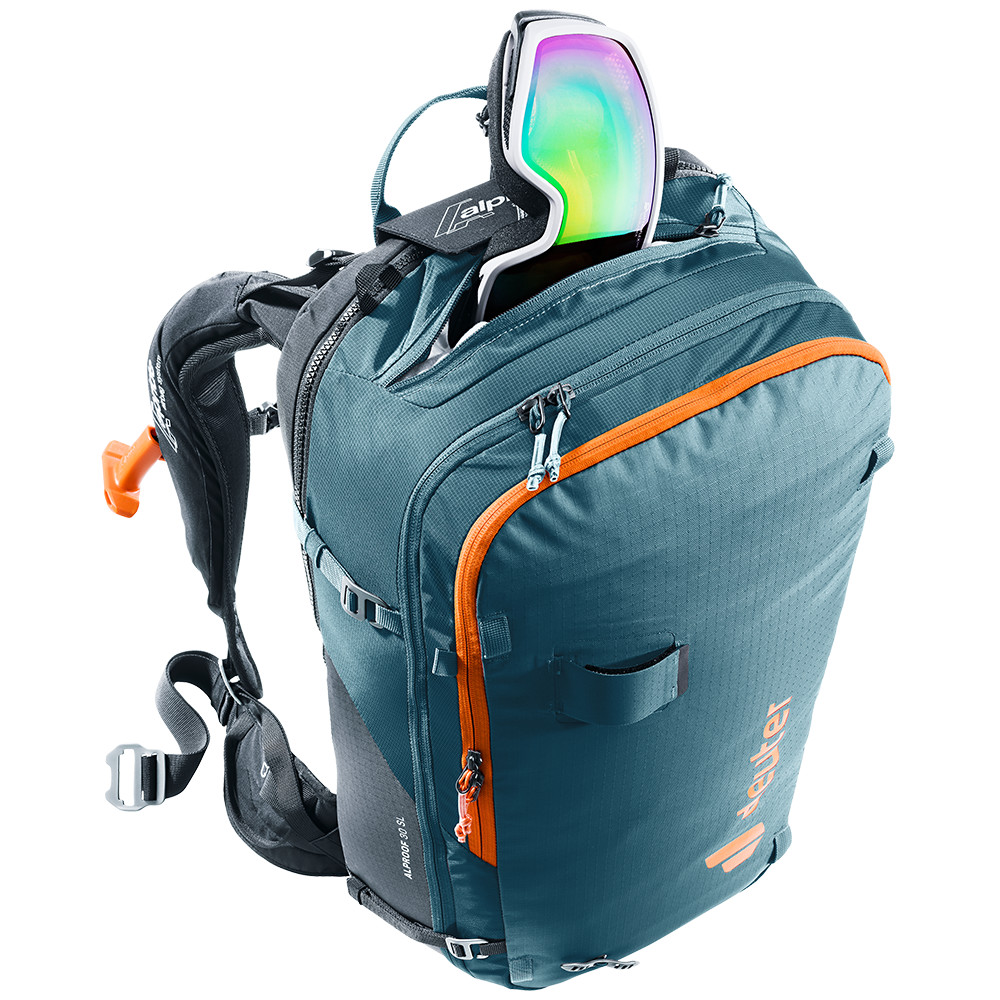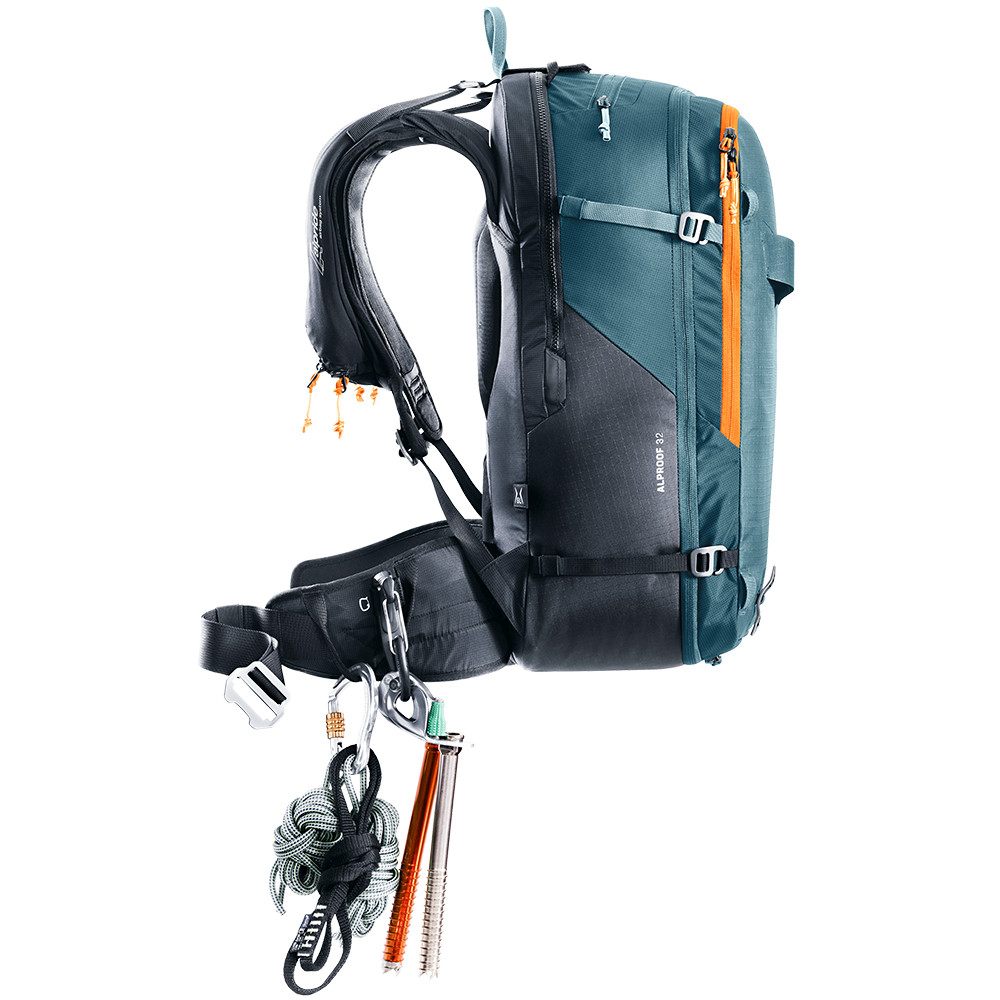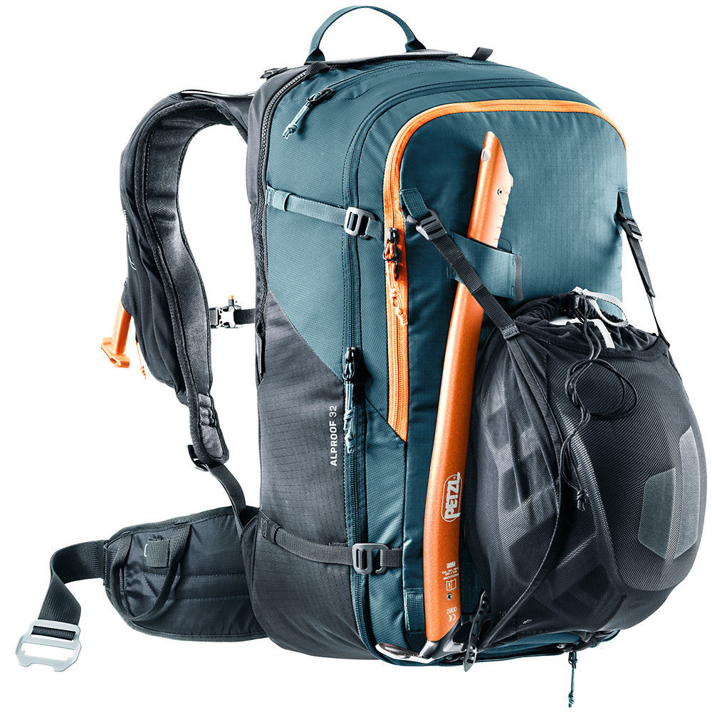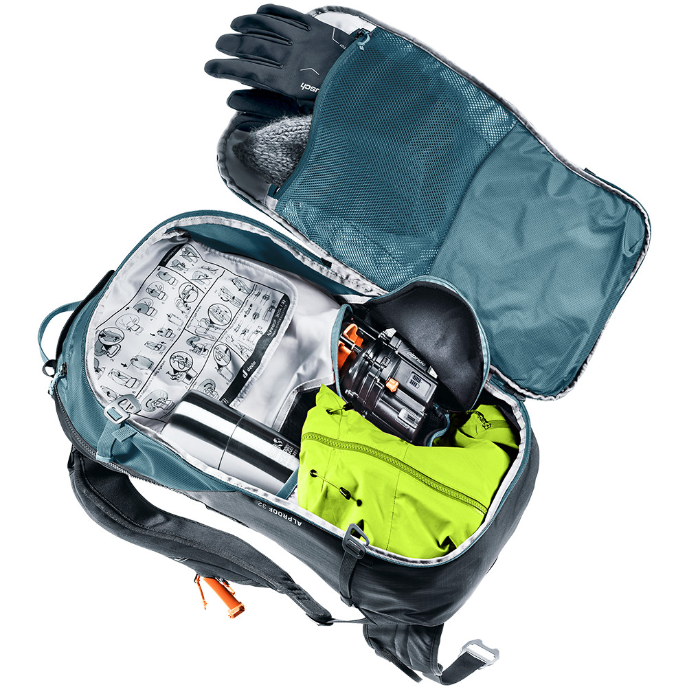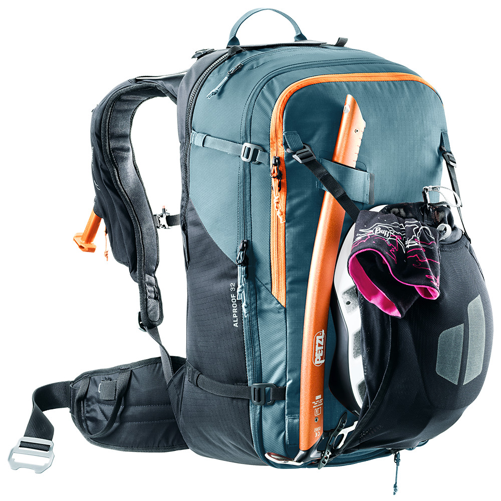 Le sac à dos Alproof 32 est suffisamment grand pour contenir l'équipement d'une journée de ski de randonnée en montagne. Il est possible d'y attacher des skis ou un snowboard, il dispose d'une poche rembourrée pour les lunettes et d'un compartiment spécial pour le matériel d'avalanche (pelle et sonde).