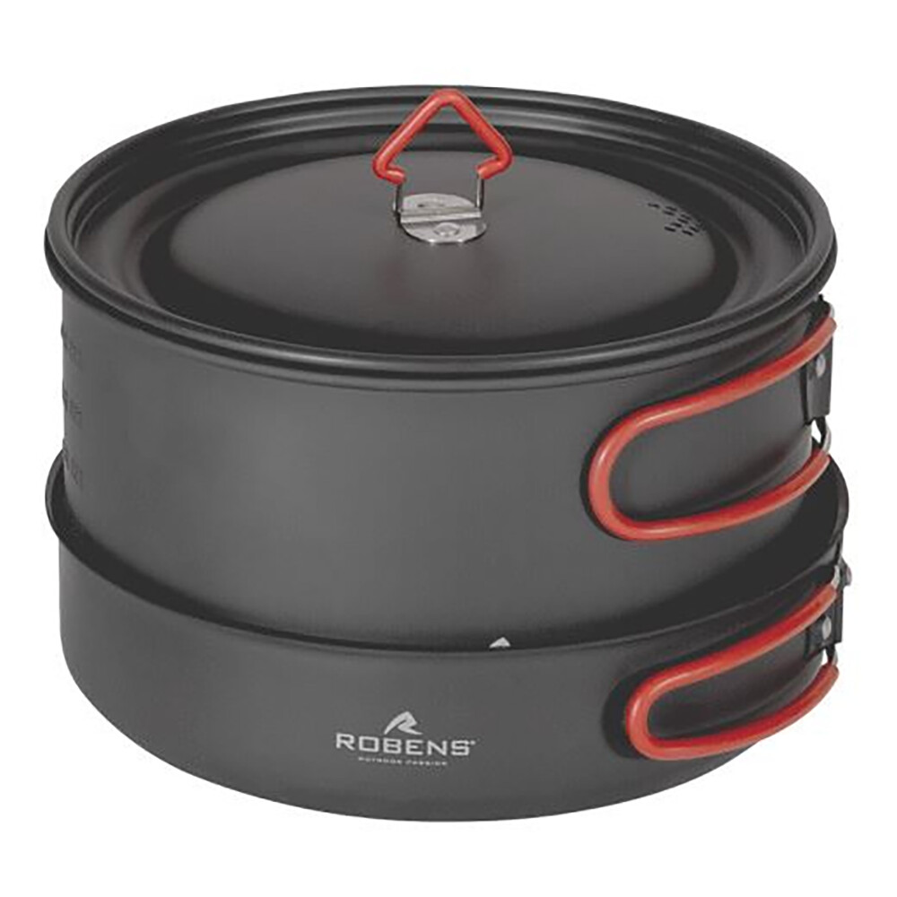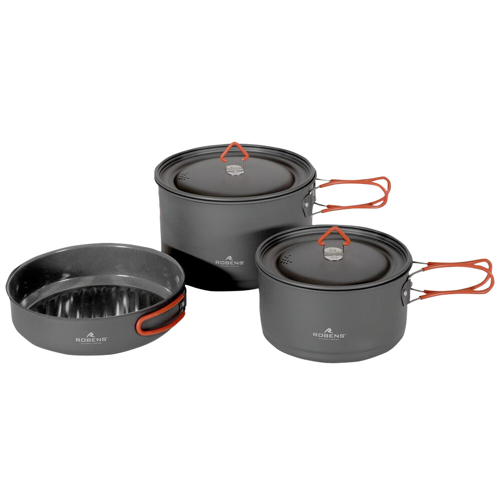 Le Basecamp Pro Ceramic Cook Set XL de Robens convient pour cuisiner pour plusieurs personnes. L'ensemble comprend deux casseroles avec couvercle et une poêle à frire. L'ensemble est fabriqué en aluminium anodisé avec une finition interne en céramique, ce qui signifie que les aliments ne brûlent pas et que les ustensiles de cuisine sont très faciles à nettoyer. Tous les ustensiles sont équipés de poignées pliantes en acier inoxydable avec des manchons en silicone. Vous n'avez donc pas à craindre de vous brûler les mains en les manipulant pendant la cuisson. Les couvercles sont perforés pour faciliter l'évacuation de l'eau excédentaire. Convient à la préparation d'aliments déshydratés ainsi qu'à la cuisine à partir de matières premières.