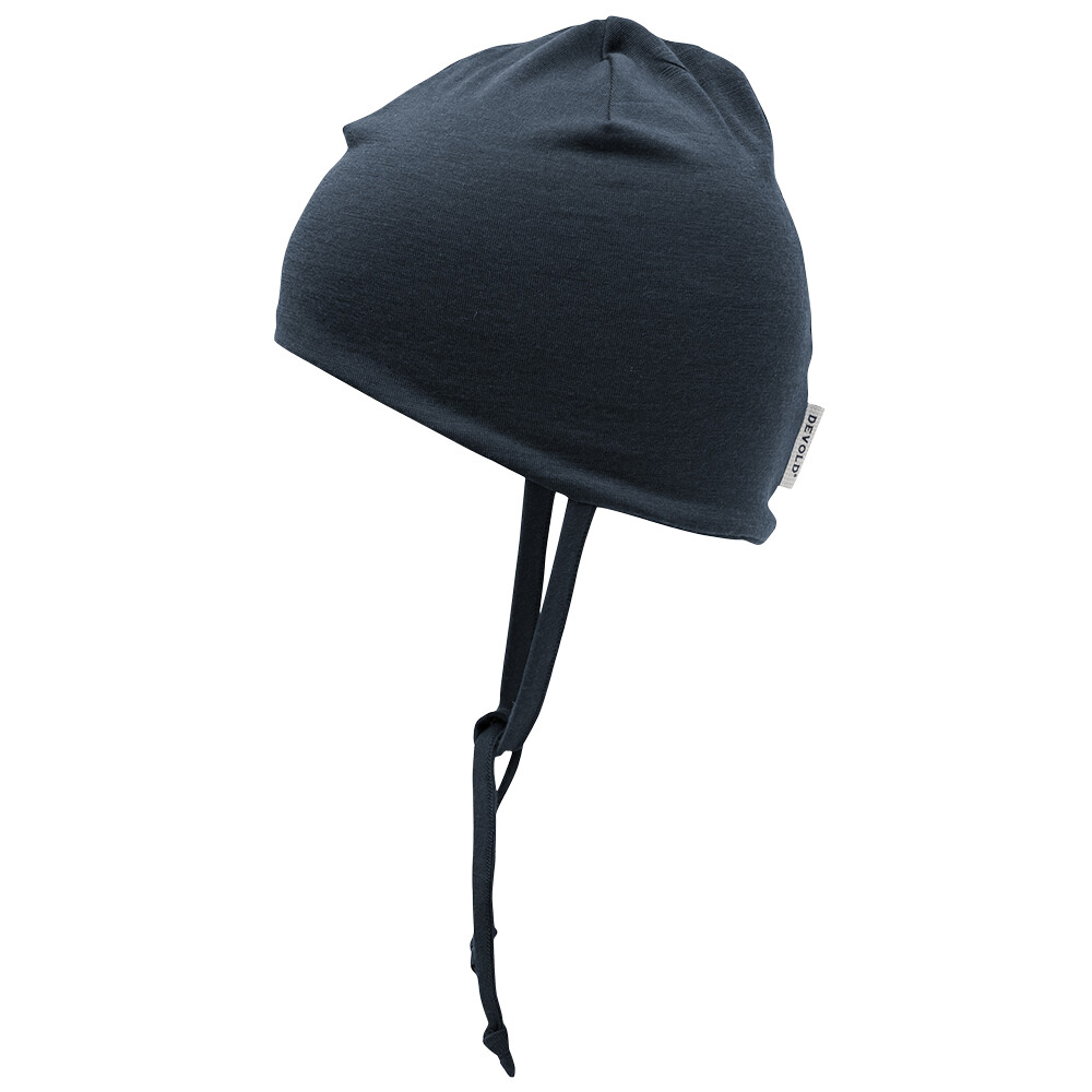 Bonnet léger et respirant Breeze Baby Beanie de la société norvégienne Devold avec une attache sous le menton. Il est composé à 100 % de laine mérinos.