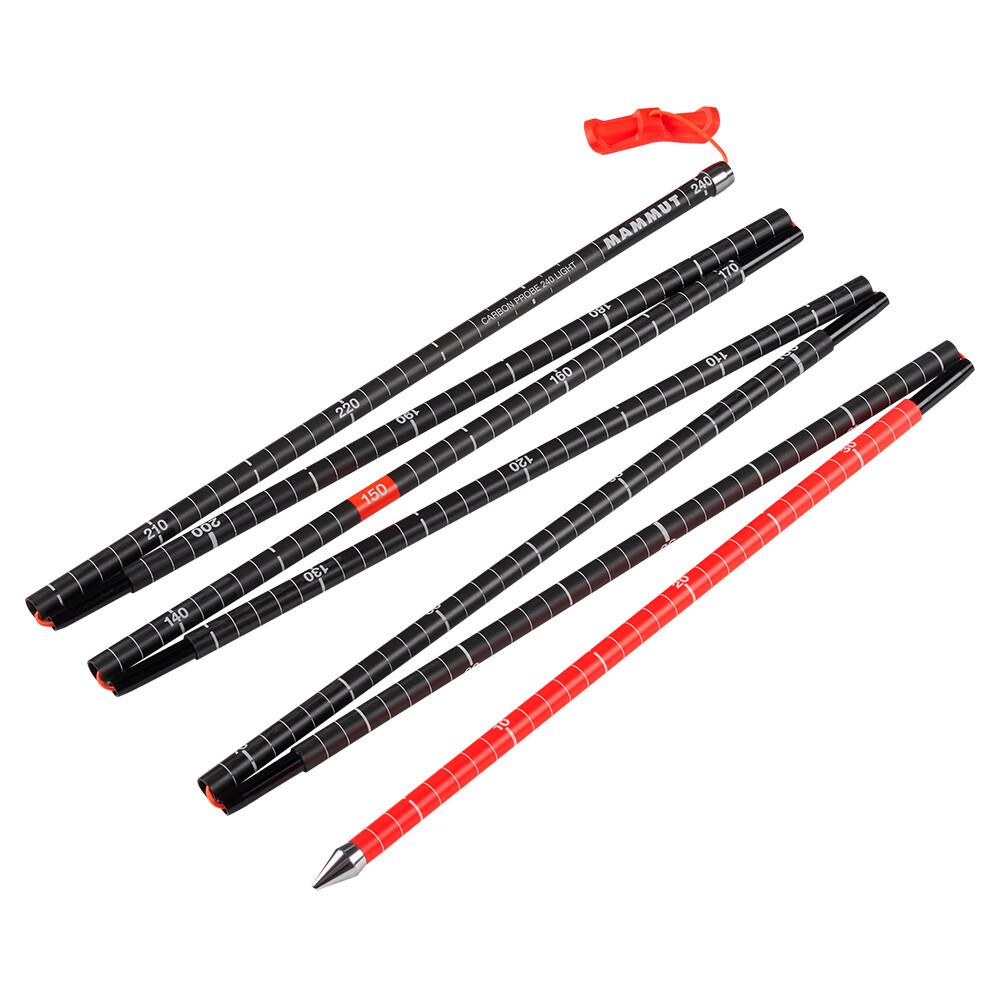 La Carbon Probe 240 Light de la marque suisse Mammut est une sonde d'avalanche ultralégère en carbone avec un système de tension télescopique. Les sept segments sont marqués d'un mètre des deux côtés. La pointe en forme de goutte d'eau vous surprendra agréablement avec une bonne pénétration de la neige lors du sondage. La partie inférieure de la sonde est surlignée en orange pour l'orientation visuelle lors de l'approche d'une avalanche.