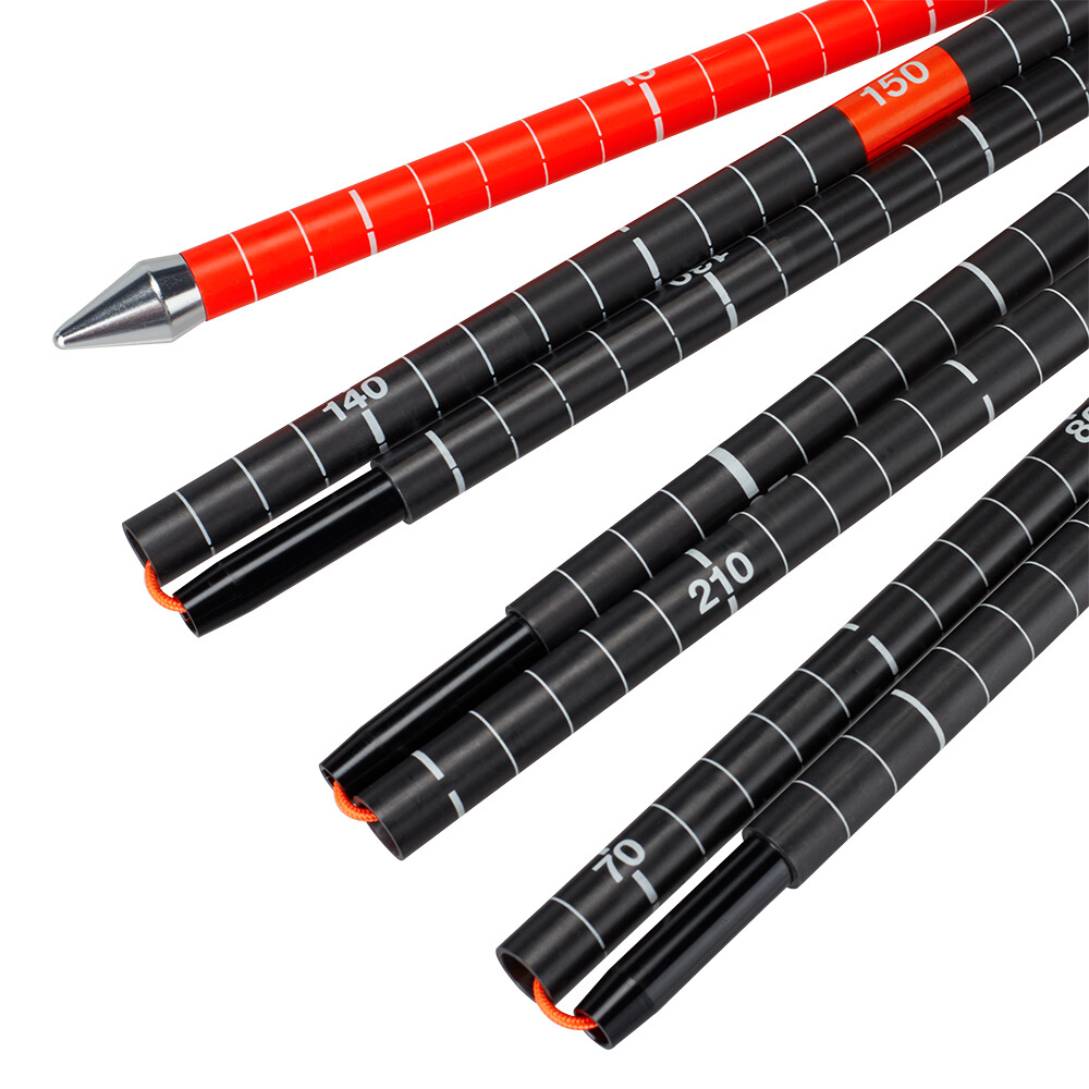 Sonde légère en carbone et verrouillage rapide. Les sept segments sont sécurisés par une longe à l'aide d'une tige de traction et d'une simple serrure. La pointe en forme de goutte d'eau vous surprendra agréablement avec une bonne pénétration de la neige lors du sondage.
