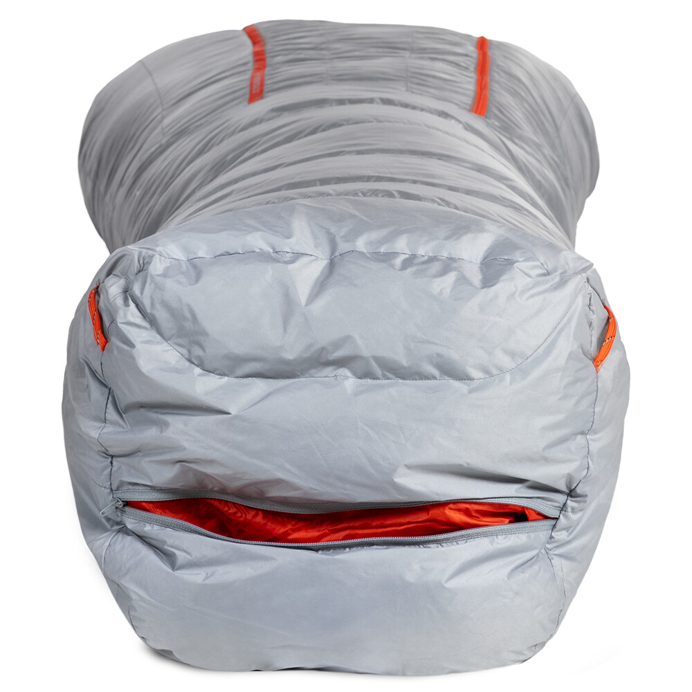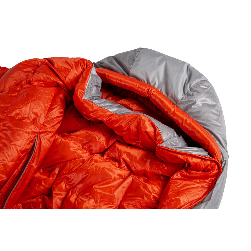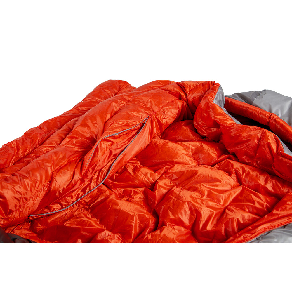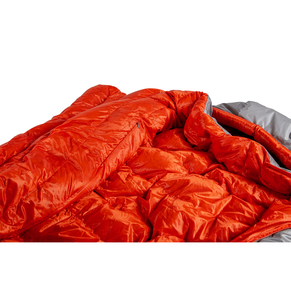 Quilt pour deux, c'est-à-dire un sac de couchage sans capuche et sans isolation de fond, avec un garnissage en plumes du traitement hydrophobe Nikwax®. Il permet de gagner de la place dans le sac à dos et d'assurer un couchage confortable sans l'espace contraignant d'une "momie" classique.