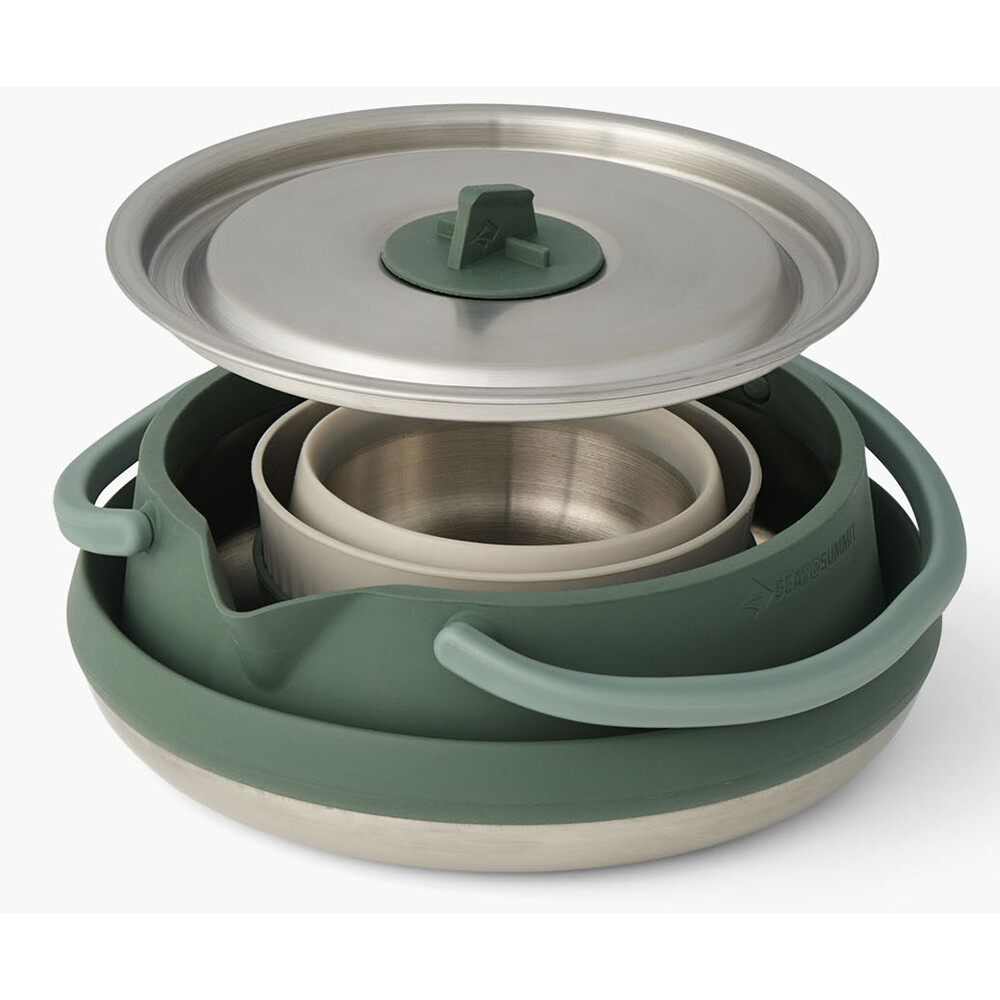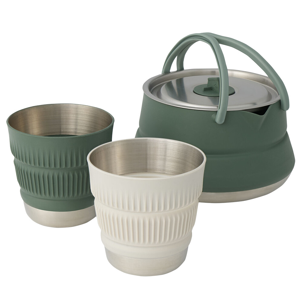 Un set de cuisine pour deux de Sea to Summit de la série Detour d'ustensiles de cuisine pliables ultra-légers en acier inoxydable, qui ravira tous les amateurs de voyages légers et les fans d'équipement minimaliste. L'ensemble comprend une théière de 1,6 litre et deux mugs. Le tout est fabriqué à partir d'une combinaison d'acier inoxydable et de silicone de qualité alimentaire. La bouilloire peut être utilisée sur tous les types de réchauds de randonnée, y compris les réchauds à induction. Elle convient pour préparer de l'eau pour les boissons chaudes et les aliments séchés, mais peut également servir de casserole pour de plus petites portions d'aliments cuits. Une fois plié, l'ensemble prend à peu près autant de place dans votre sac qu'un powerbank d'extérieur.