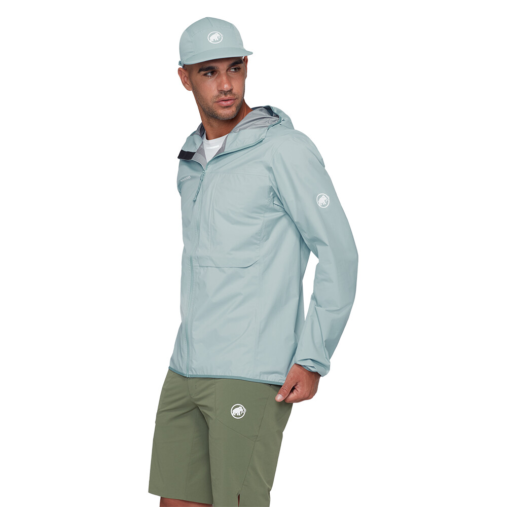 La veste est fabriquée avec la membrane Mammut DRY Active. Elle est donc imperméable, respirante et coupe-vent. Un brevet sur la poitrine permet d'ouvrir le zip central et de réguler la température en cas d'activité physique accrue. La capuche préformée s'ajuste parfaitement. Les manches préformées sont complétées par des poignets élastiques. La poche intérieure est plus grande. Les coutures des épaules sont positionnées de manière à ne pas gêner l'utilisation d'un sac à dos. L'ourlet inférieur est élastique. La veste se range simplement dans la poche de poitrine.