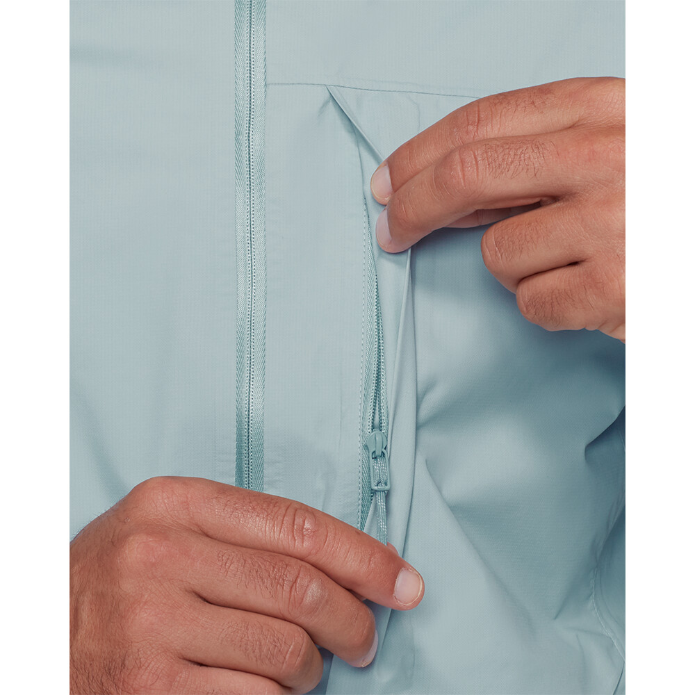Veste imperméable et coupe-vent pour hommes, avec capuche réglable pour protéger de la pluie. Une ventilation zippée sous les bras permet de réguler la température lors d'activités plus exigeantes. Les poignets des manches sont réglables par velcro.