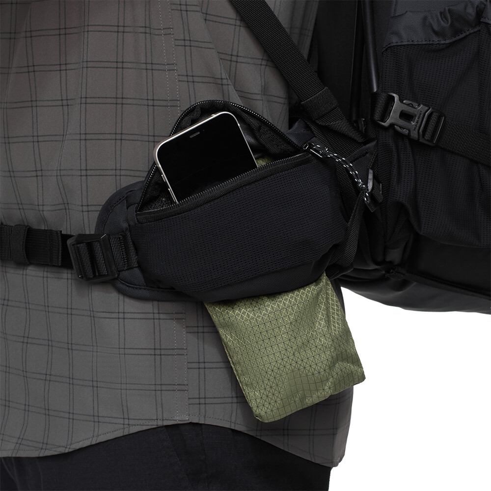 Le sac est facile d'accès grâce à une fermeture à enroulement sur la partie supérieure et à une grande fermeture à glissière sur la partie inférieure. Le volume du sac à dos peut varier entre 70 et 80 litres grâce à la fermeture à enroulement. Les objets importants tels que les bouteilles d' eau sont toujours à portée de main grâce aux poches en filet. Une veste imperméable trouve sa place dans la grande poche avant en filet, tandis que les barres énergétiques peuvent être rangées dans les poches situées sur les bretelles. Et votre téléphone portable ? Il a sa propre poche pliable sur la ceinture. Tout le reste trouve sa place dans le spacieux compartiment principal.