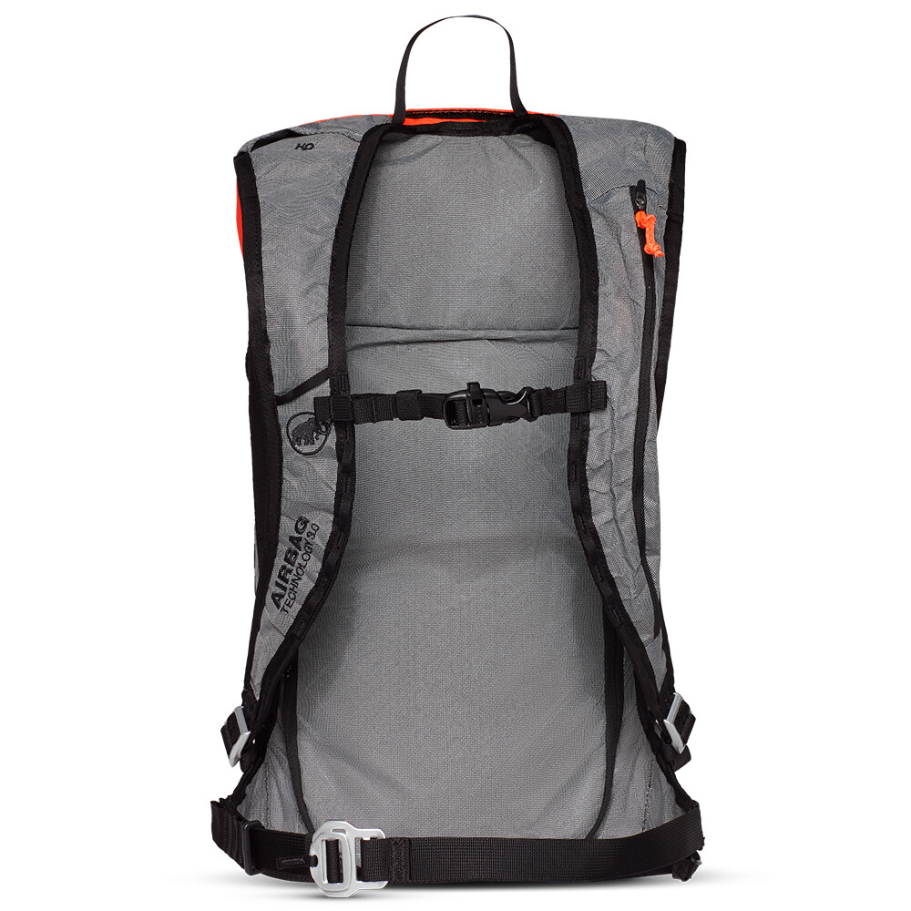 Sac à dos d'avalanche avec airbag. Il est léger et dispose d'un système dorsal confortable en mousse EVA thermoformée. Possibilité de fixer des skis, un snowboard, un casque, un piolet et d'autres équipements. Éléments orange pour une meilleure visibilité.