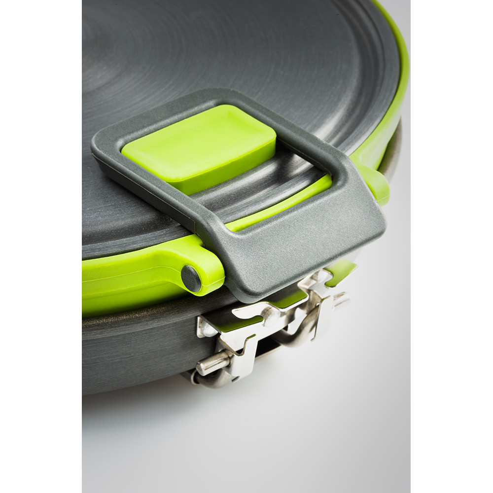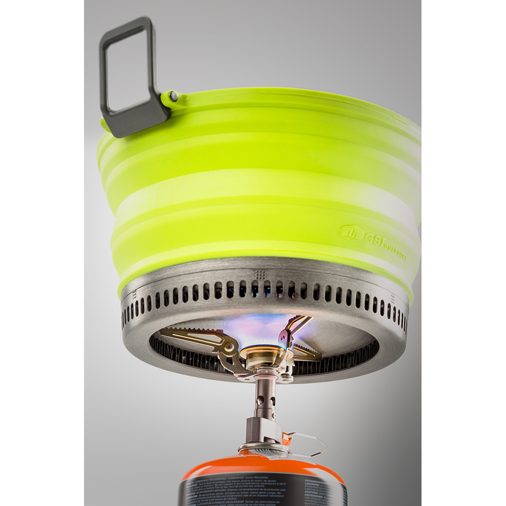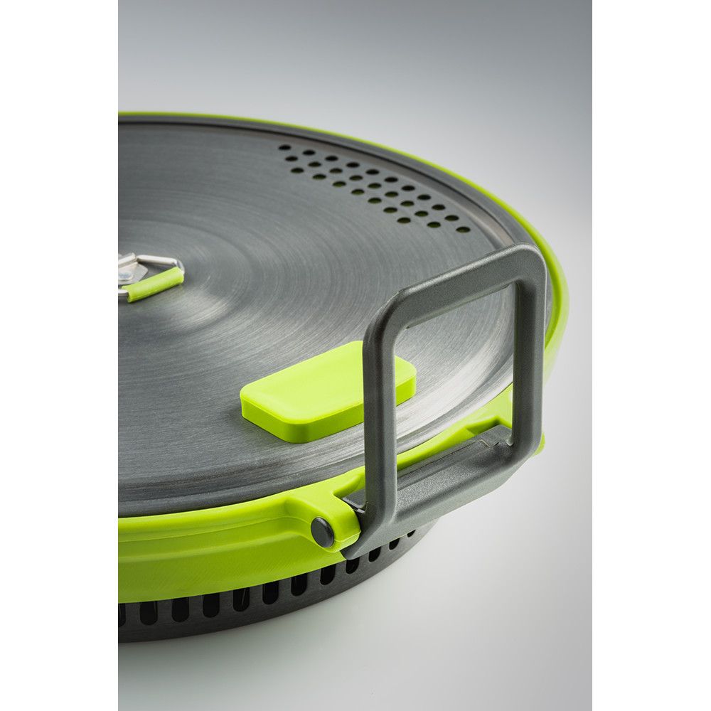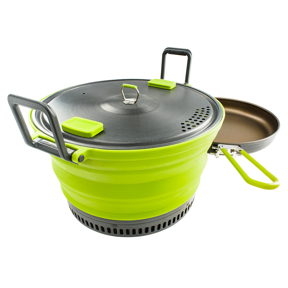 Marmite pliable avec échangeur de chaleur, couvercle et casserole. La marmite et la casserole ont un fond en téflon pour éviter que les aliments ne brûlent. La casserole est munie d'une poignée intégrée et la marmite de poignées qui la rendent facile à transporter. Le couvercle est doté d'une grille spéciale qui permet à la vapeur de s'échapper et peut également être utilisé pour verser facilement l'eau. La marmite GSI vous accompagnera volontiers pendant une semaine en montagne ou au camping.