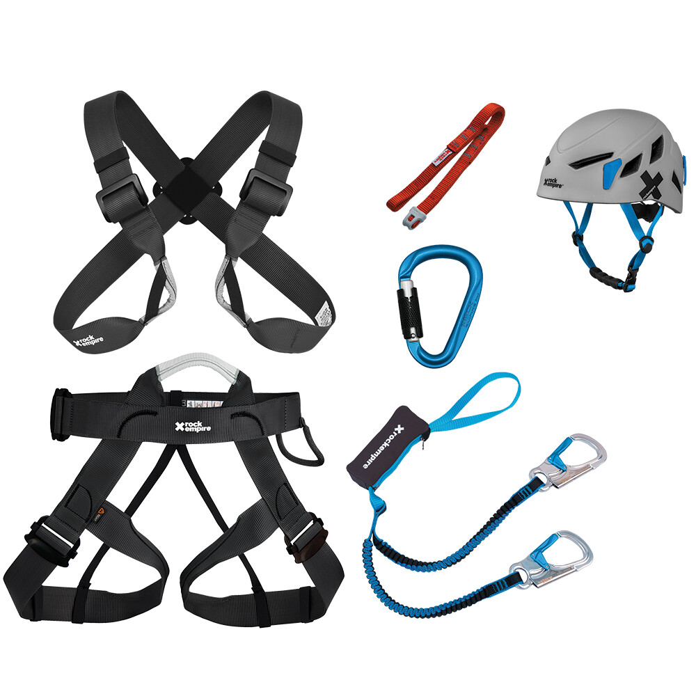 Un ensemble complet de ferrata qui comprend un harnais complet Ronda amélioré et un amortisseur de chute DynaGo.