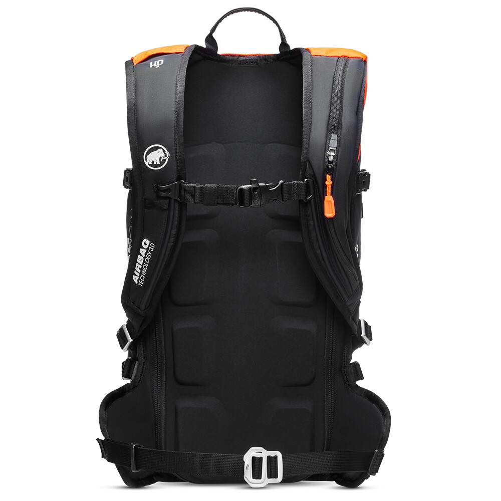 Sac à dos d'avalanche avec airbag. Il est léger et dispose d'un système dorsal confortable en mousse EVA thermoformée. Possibilité de fixer des skis, un snowboard, un casque, un piolet et d'autres équipements. Éléments orange pour une meilleure visibilité.