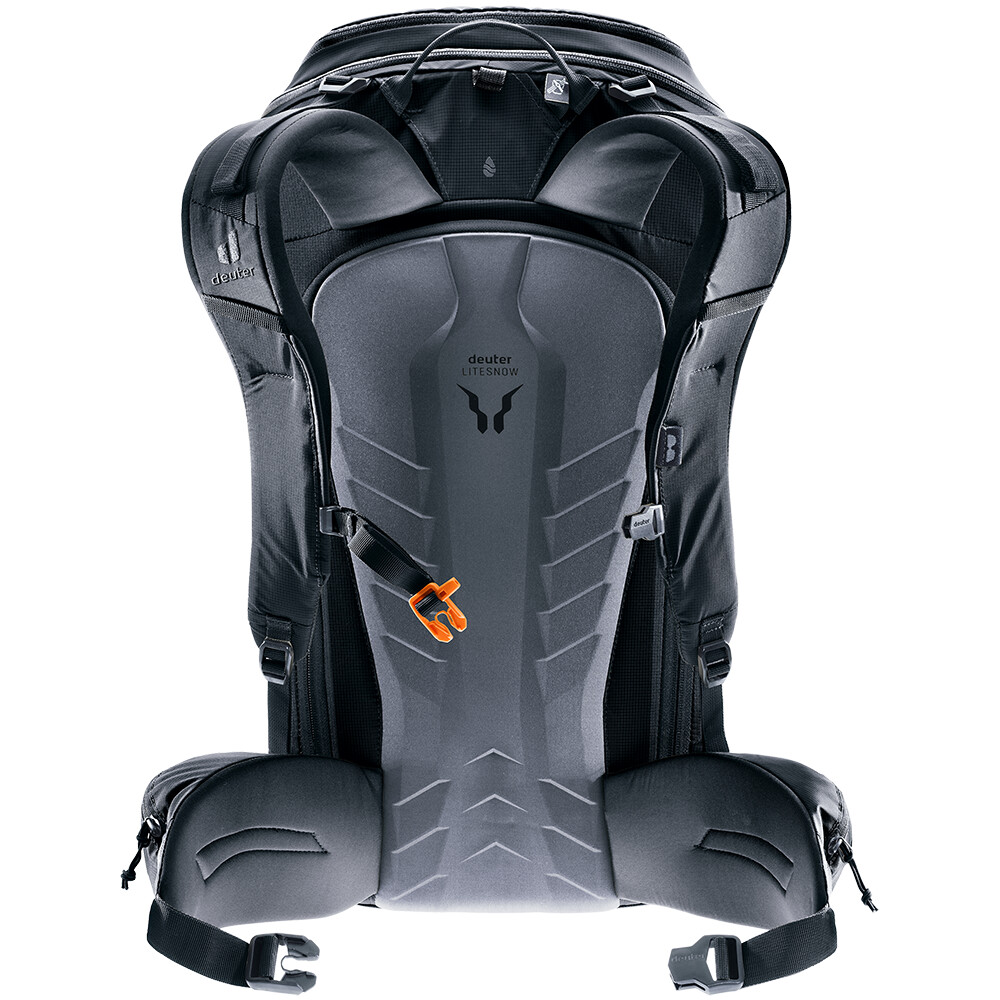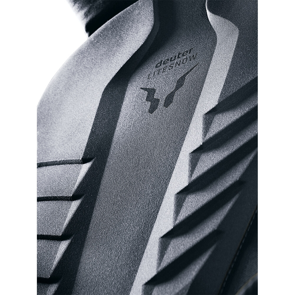 Le système dorsal LiteSnow de Deuter est ultraléger, extrêmement confortable et imperméable. Le rembourrage du dos a une forme spéciale avec des espaces entre la mousse EVA et le matériau Spandex. De cette façon, la neige que vous ramassez dans la descente ne reste pas sur votre dos, le matériau n'absorbe pas l'humidité et assure un confort de portage tout au long de la journée. Bien entendu, les bretelles sont matelassées et les ceintures de poitrine et de taille sont réglables. De plus, la boucle de la sangle de poitrine peut être actionnée d'une seule main, même avec des gants d'hiver épais.