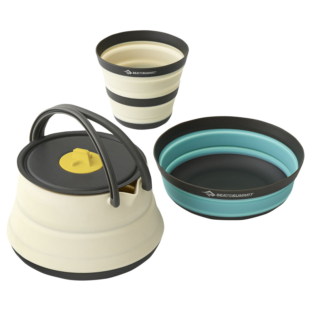 Un set de cuisine pour une personne de Sea to Summit, issu de la série Frontier d'ustensiles de cuisine pliants en silicone ultralégers, qui ravira tous les amateurs de voyages légers et les fans d'équipement minimaliste. L'ensemble comprend une théière de 1,3 litre, une tasse et un bol. La théière a un fond en aluminium anodisé, ce qui permet de l'utiliser facilement sur un réchaud de randonnée à gaz ou un réchaud électrique. Vous pouvez l'utiliser pour préparer de l'eau pour des boissons chaudes et des aliments secs, mais elle peut également servir de casserole pour de petites portions d'aliments cuits. Une fois replié, l'ensemble prend à peu près autant de place dans votre sac qu'un powerbank d'extérieur.