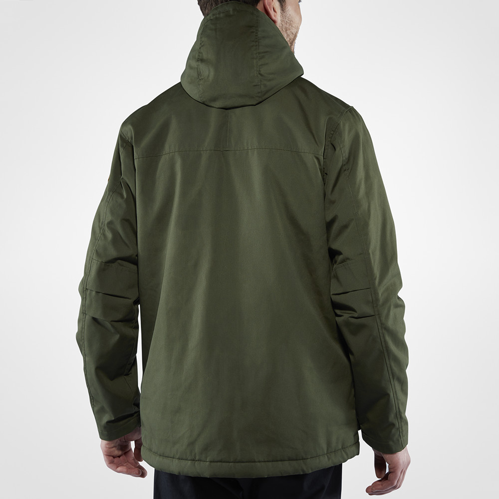 Veste d'hiver pour homme fabriquée dans un matériau durable et souple. Les épaules sont renforcées pour une plus grande durabilité lors du port d'un sac à dos. La capuche et l'ourlet peuvent être ajustés. La veste peut être cirée pour une meilleure résistance à l'eau.