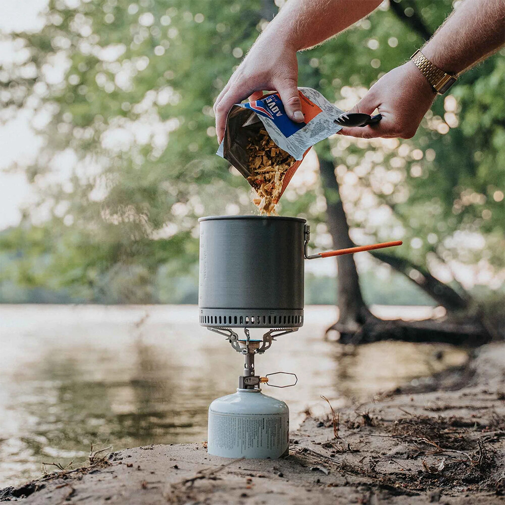 Ensemble complet de cuisine et de service de GSI, convenant à deux personnes. Comprend une casserole en aluminium anodisé durable, équipée d'un échangeur de chaleur. Celui-ci permet de faire bouillir l'eau jusqu'à 30 % plus rapidement et d'économiser du carburant pour la cuisinière. La marmite est équipée d'un couvercle avec des trous pour verser l'eau et d'une poignée rabattable. L'ensemble comprend également deux bols et deux tasses. Leur forme large et leur centre de gravité bas empêchent tout basculement accidentel, et le manchon isolant garde les boissons et les aliments chauds plus longtemps. Pour gagner de la place dans votre sac à dos, rangez l'ensemble, y compris les deux cuillères pliables, à l'intérieur de la marmite.