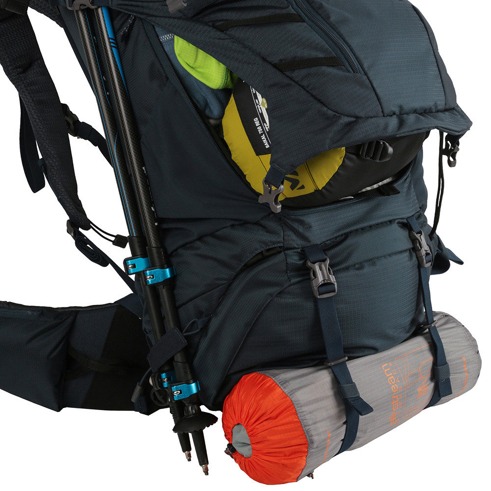Sac à dos de randonnée doté de nombreuses poches pratiques pour ranger les objets nécessaires à une randonnée de plusieurs jours. Il comprend également un imperméable et des boucles pour attacher les bâtons de trekking.