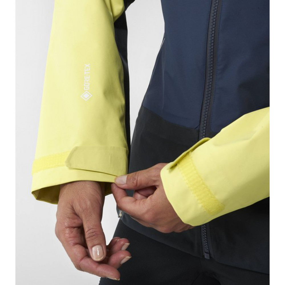 Veste technique imperméable pour femmes, destinée à toutes les grimpeuses et alpinistes... Combine deux types de Gore-tex pour réduire le poids. Elle est équipée de fermetures éclair sous les bras, d'une capuche compatible avec le port d'un casque et du système Recco®.