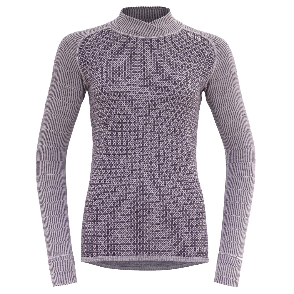 Chemise réversible pour femme à col montant Kvitegga Merino 230 Cross Neck de la société norvégienne Devold. Elle est composée à 100 % de laine mérinos. Les poches d'air microscopiques de la laine permettent une rétention optimale de la chaleur.