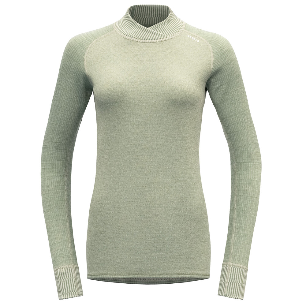Chemise réversible pour femme à col montant Kvitegga Merino 230 Cross Neck de la société norvégienne Devold. Elle est composée à 100 % de laine mérinos. Les poches d'air microscopiques de la laine permettent une rétention optimale de la chaleur.