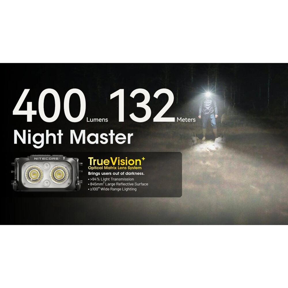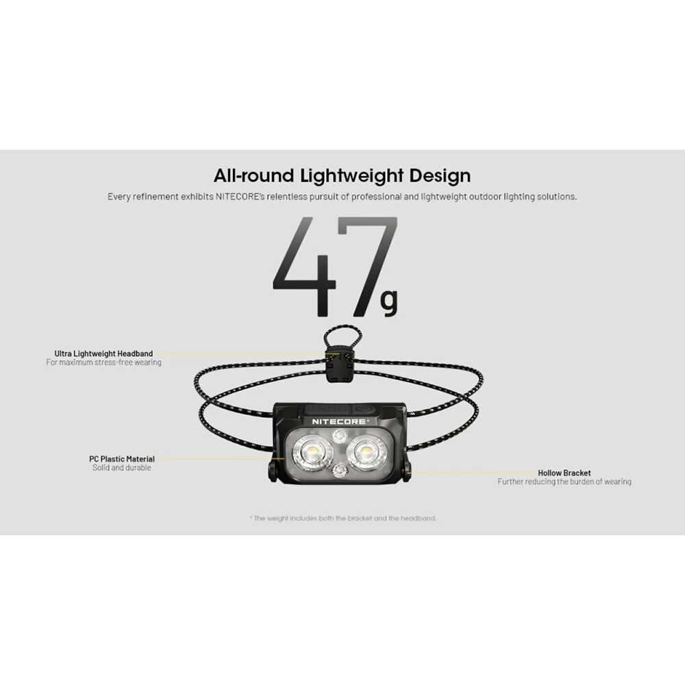 La lampe frontale NU25 MCT de Nitecore séduit par plusieurs caractéristiques. La première est son poids plume de seulement 47 g. En même temps, grâce à la nouvelle technologie LED UHE, elle offre jusqu'à 400 lm de puissance avec une portée de 132 m. Une caractéristique intéressante est la possibilité de choisir entre trois températures de lumière (couleurs) différentes. La lampe frontale est commandée par deux boutons, l'un pour régler l'intensité de la lumière, l'autre pour sélectionner la température de la lumière. Bien entendu, la lampe est équipée d'un indicateur de charge de la batterie et d'un dispositif de verrouillage contre l'allumage accidentel. La variante minimaliste de la sangle avec un cordon de serrage à l'arrière tient bien sur la tête et la lampe frontale est donc parfaitement adaptée à la course à pied, au trekking, au camping et à d'autres activités.
