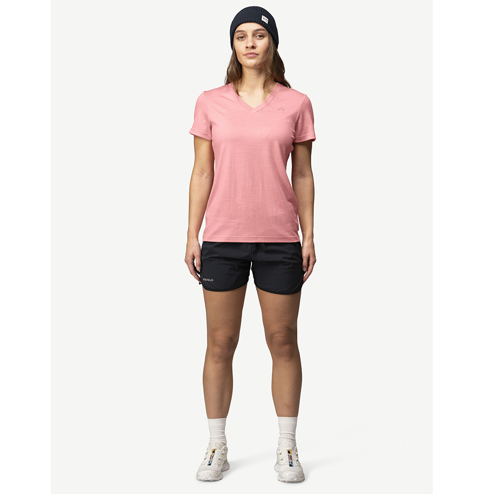 Le T-shirt Premium à col en V pour femme de la société norvégienne Devold s'associera à une jupe et à un short.