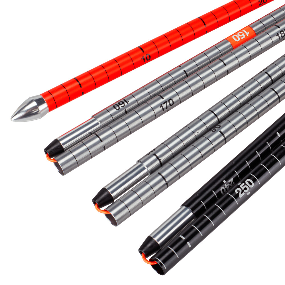 Sonde légère en carbone et verrouillage rapide. Les sept segments sont sécurisés par une longe à l'aide d'une tige de traction et d'une simple serrure. La pointe en forme de goutte d'eau vous surprendra agréablement avec une bonne pénétration de la neige lors du sondage.
