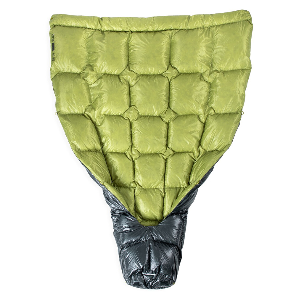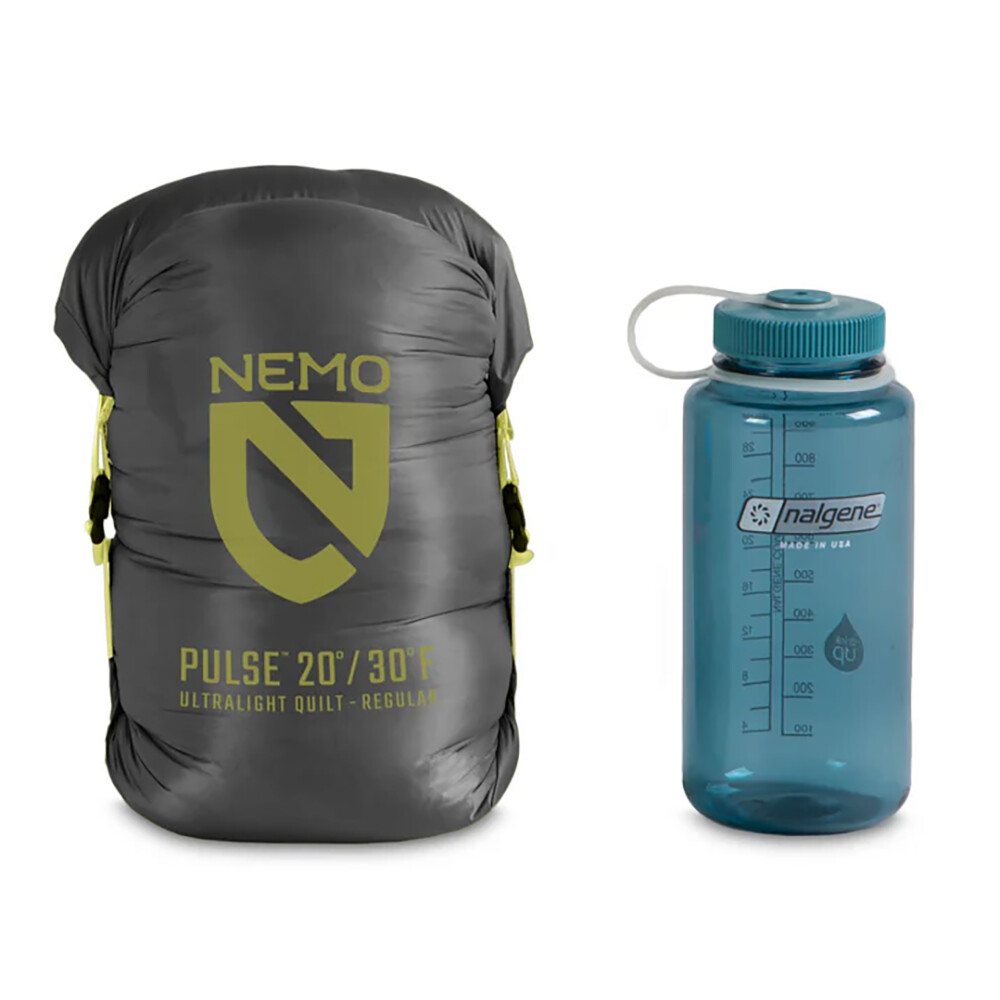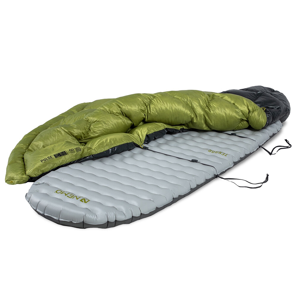 La couverture de type quilt, c'est-à-dire un sac de couchage sans fermeture éclair, sans capuche et sans la partie isolante inférieure, est idéale comme option légère pour dormir dans une tente, un sac de couchage ou un hamac. L'isolation se compose de duvet de haute qualité avec protection contre l'humidité (couche avec particules d'or). L'édredon est conçu comme une couverture matelassée pour éviter qu'il ne s'affaisse, de sorte que les plumes restent uniformément réparties. La partie supérieure autour du cou est munie d'un cordon de serrage et peut être attachée dans le dos. Des sangles sont également incluses pour la fixation au matelas d'une voiture. Le Quilt Pulse fait partie de la collection Endless Promise de Nemo, qui s'engage à produire de manière durable en utilisant des matériaux recyclés.