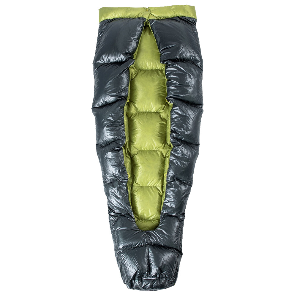 Sac de couchage en duvet, adapté à une utilisation en trois saisons pour des randonnées de plusieurs jours. La construction trapézoïdale des chambres empêche la formation de duvet et de points froids pendant la nuit. Fermeture éclair intégrale, forme rectangulaire "couverture".