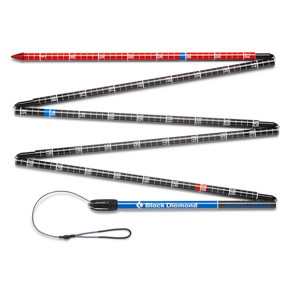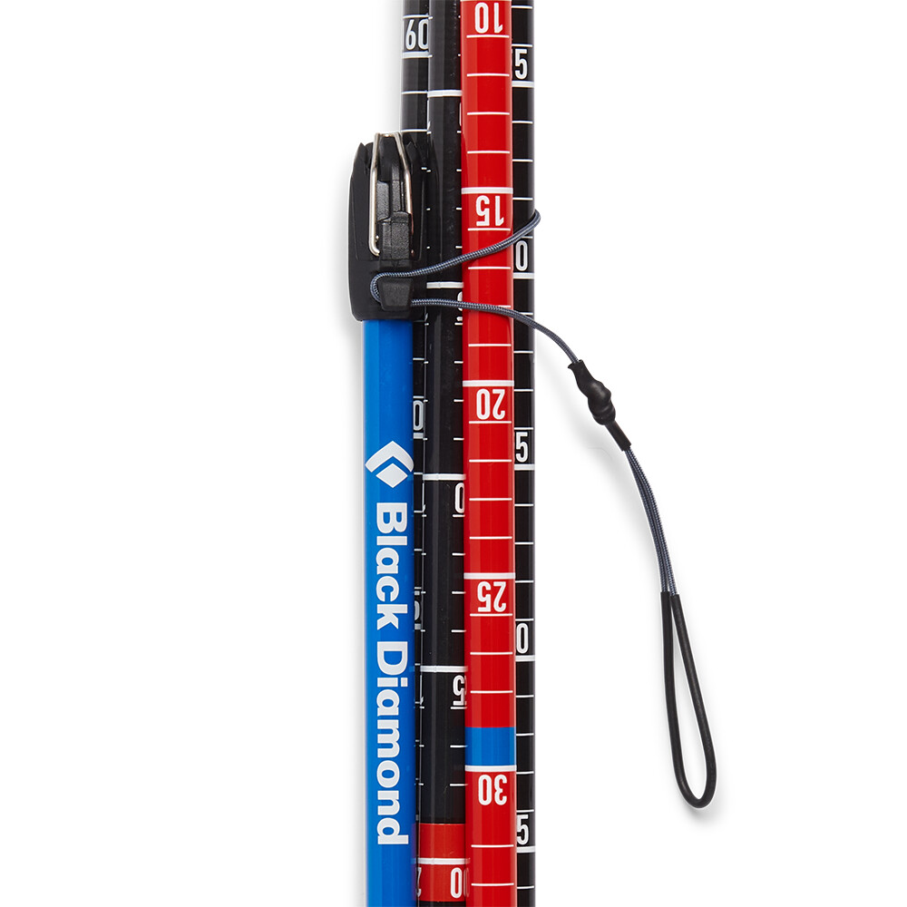 Sonde légère en carbone et verrouillage rapide. Les sept segments sont sécurisés par une longe à l'aide d'une tige de traction et d'une simple serrure. La pointe en forme de goutte d'eau vous surprendra agréablement avec une bonne pénétration de la neige lors du sondage.