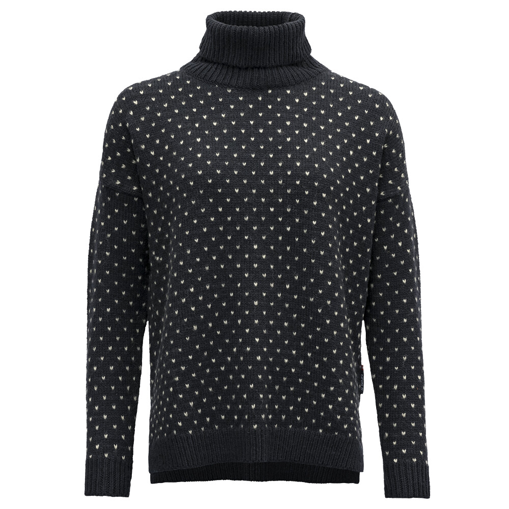 Pull Sorisen pour femme en laine norvégienne de Devold. Ce pull convient comme deuxième ou troisième couche, idéal par temps froid ou glacial. Le col roulé gardera votre cou au chaud et éloignera le gel de votre corps. Enfilez une veste isolante par-dessus le pull et vous serez pleinement satisfait.