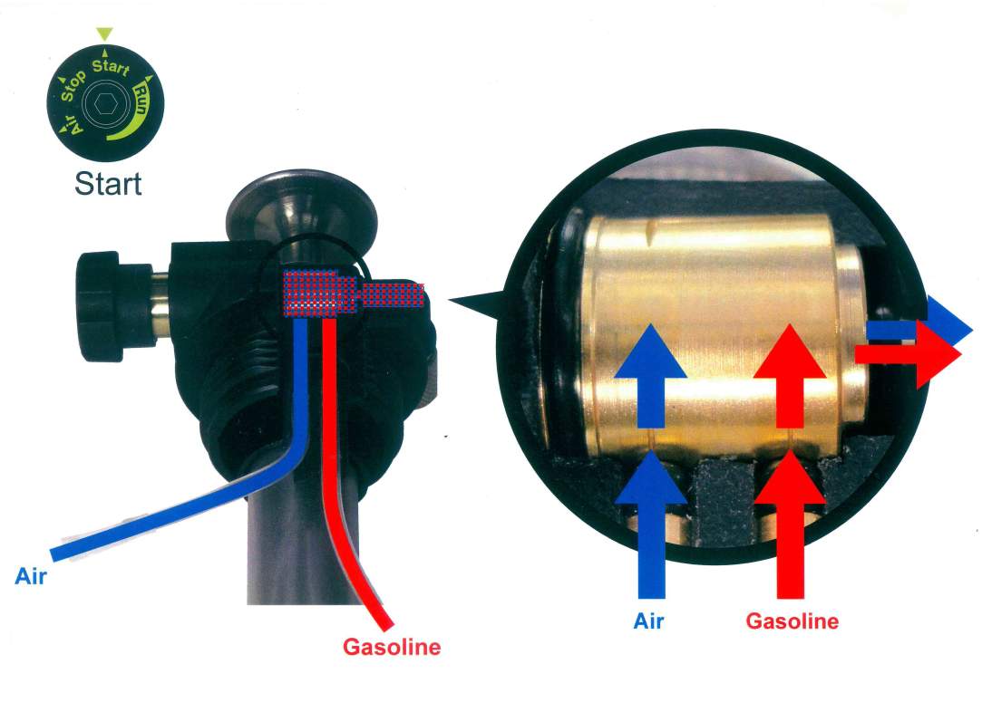 En position arrêt, la bouteille est poussée. Pour passer aux autres modes, la roue doit être déployée. Dans le cas contraire, la roue peut être tournée, mais les autres modes ne sont pas activés. En mode démarrage, la pompe à carburant agit comme un carburateur, mélangeant le carburant à l'air de manière à ce que le mélange pénètre dans la cuisinière et n'ait plus qu'à être enflammé. La flamme chauffe alors le tube de gazage. Le cadran peut alors être mis en mode de fonctionnement, c'est-à-dire en mode cuisson. Dans ce mode, vous pouvez également contrôler la quantité de combustible brûlé dans le brûleur.