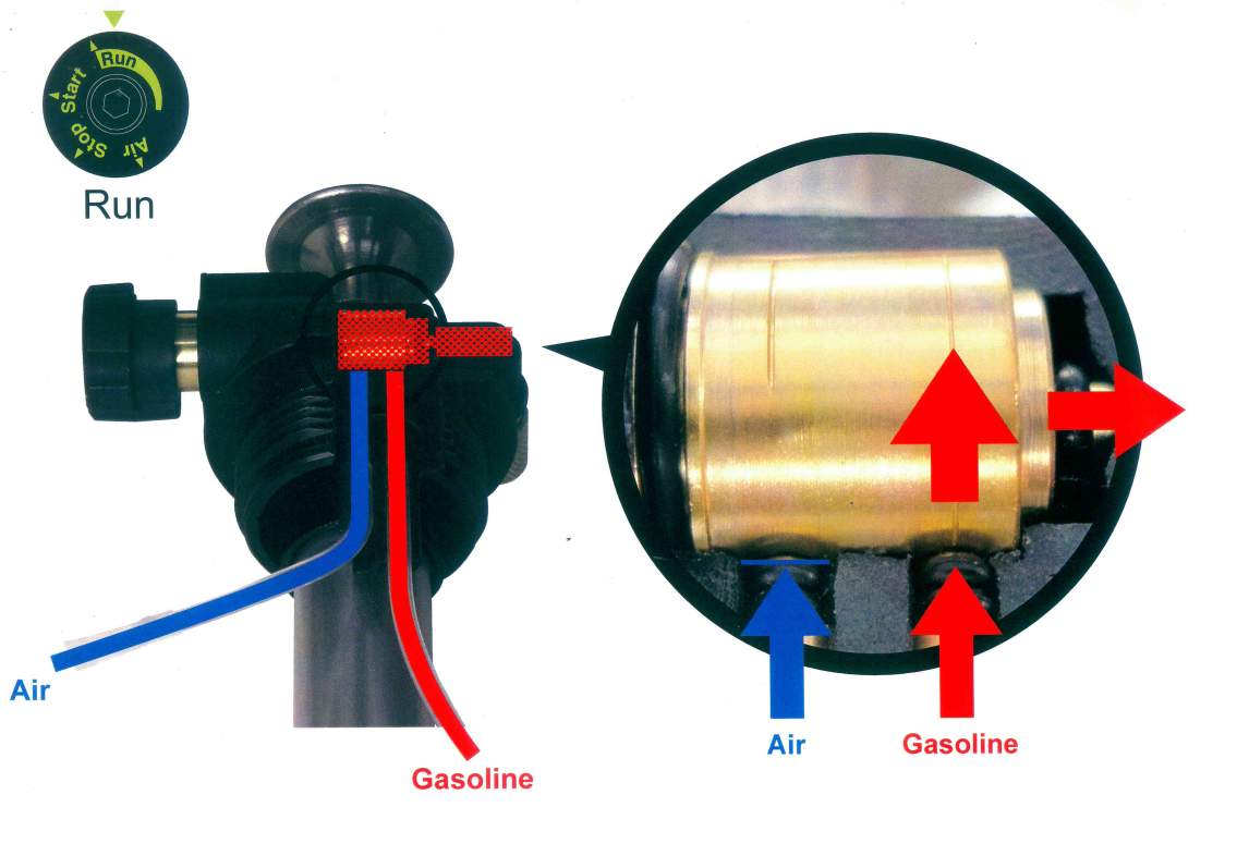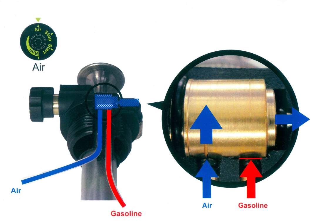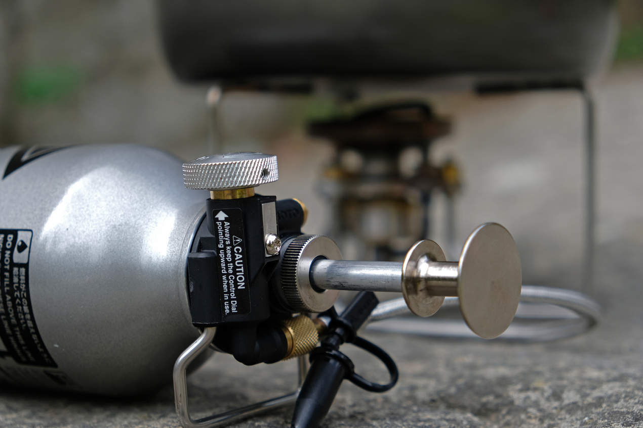Il existe une pompe très sophistiquée pour utiliser votre cuisinière avec de l'essence. Elle présente deux caractéristiques particulières. D'une part, ce n'est pas un mais deux tuyaux qui en sortent et, d'autre part, elle est équipée d'une molette de commande. Le tuyau le plus long sert à transporter le carburant et le plus court aspire l'air. Cela signifie également que, pour que la pompe fonctionne correctement, la bouteille doit toujours être placée avec la molette vers le haut. La molette située sur la pompe permet alors de passer d'un mode à l'autre : arrêt, marche, fonctionnement et air. En même temps, la molette fait office de régulateur de flamme.