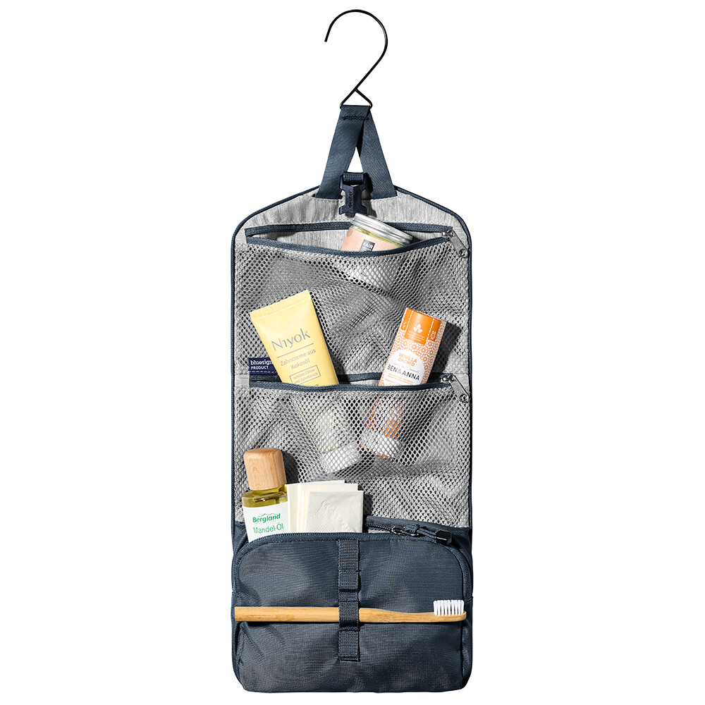 Le Wash Bag I de deuter dispose d'un crochet amovible qui vous permet de le suspendre dans la salle de bain ou à divers endroits (par exemple sur une branche) lors de vos voyages. Un grand compartiment zippé et deux poches en filet zippées permettent une organisation claire. Une fermeture à boucle permet de ranger le contenu en toute sécurité, tandis que des boucles élastiques peuvent être utilisées pour la brosse à dents et les petits articles de toilette.